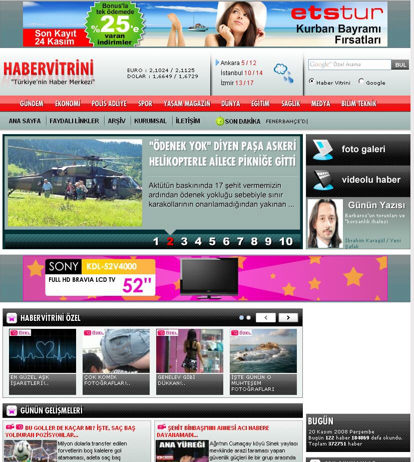 HABERVİTRİNİ günlük olarak yayınladığı 200 civarındaki sıcak haberle Türkiye\\\'nin en çok takip edilen haber portallarından biridir. Türkiye ve dünya gündemi anında Habervitrini\\\'nde yer bulur. Site, olayları yorumlayan yazarları, günlük gazetelerin ana sayfaları ve müthiş fotoğraflarıyla habersiz kalmak istemeyenlerin ilk tercihidir. Genç - yaşlı 100 bin tekil IP\\\'lik okuyucu kitlesi olan Habervitrini, aylık 13 milyona yakın sayfa gösterimiyle Türkiye\\\'nin başvuru ve buluşma noktasıdır. Siyasetçiden bürokrata, ekonomistten medyaya ve spordan sanata kadar Habervitrini Türkiye\\\'nin haber merkezidir. Dünyada 157 farklı ülkeden okuyucusu olan Habervitrini, Türkiye\\\'den her yaş gurubuna hitap eden en etkili ve en hızlı internet gazetesidir.