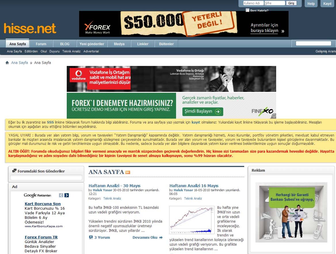Türkiye’nin ilk ve en büyük borsa ve ekonomi portalı olan hisse.net, kurulduğundan bu yana borsa yatırımcılarını ve kurumlarını bir araya getirmektedir. Her hafta güncel teknik analizlerin de yer aldığı sitede ayrıca Türkiye’nin en büyük borsa forumu bulunmaktadır. Forumda üyeler 20.000’i aşkın konuda fikirlerini dile geirmekte ve tüm piyasanın nabzı hisse.net'te atmaktadır.