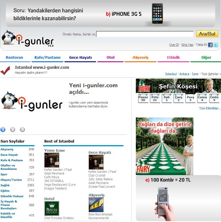 www.i-gunler.com, Mayıs 2000’de kurulduğu ilk günden itibaren Kent Rehberi olarak geniş bir kitleye hitap etmektedir. Ekim 2007 itibari ile yeni tasarım ve yenilikleri hayata geçiren i-gunler.com’un ziyaretçileri, istedikleri mekana indirimli online rezervasyon yaptırabilmekte, mekanlara yorum yaparak puan verebilmekte, davetiye kazanabilmekte, sarı sayfalar ile şehirdeki kamu kuruluşlarından tarihi yerlere kadar her sektörün adres ve telefon bilgilerine ulaşabilmektedirler. Etkinlik takvimi ile şehirdeki organizasyon, eğlence ve faaliyetlerden haberdar olan kişiler, gitmeyi düşündükleri ya da adını duydukları bir mekan hakkındaki tüm bilgilere site aracılığıyla ulaşabilmektedirler. Kısaca, www.i-gunler.com, şehirlerin nabzını tutan; ne, nerede, ne zaman gibi sorulara cevap bulunabilecek, sektörde bir numara olmayı hedefleyen bir yaşam portalıdır.